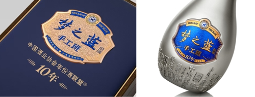 夢之藍手工班是首家獲得“中國酒業協會”授權、由第三方認證機構“方圓標志認證集團有限公司”權威認證的中國高端年份白酒。其中,夢之藍手工班(10年)延續了手工班系列的經典風格,瓶身選用青槍色為主體色調,展現產品渾厚內斂的品質內涵,寓意手工釀造的時間積淀與工藝傳承。外盒正面延續經典活字印刷元素,展現手工之美;局部細節精致打造郵票造型,體現產品珍貴紀念感;側面用木紋材質年輪交疊中時光流轉,呼應老酒老窖的年份賣點。